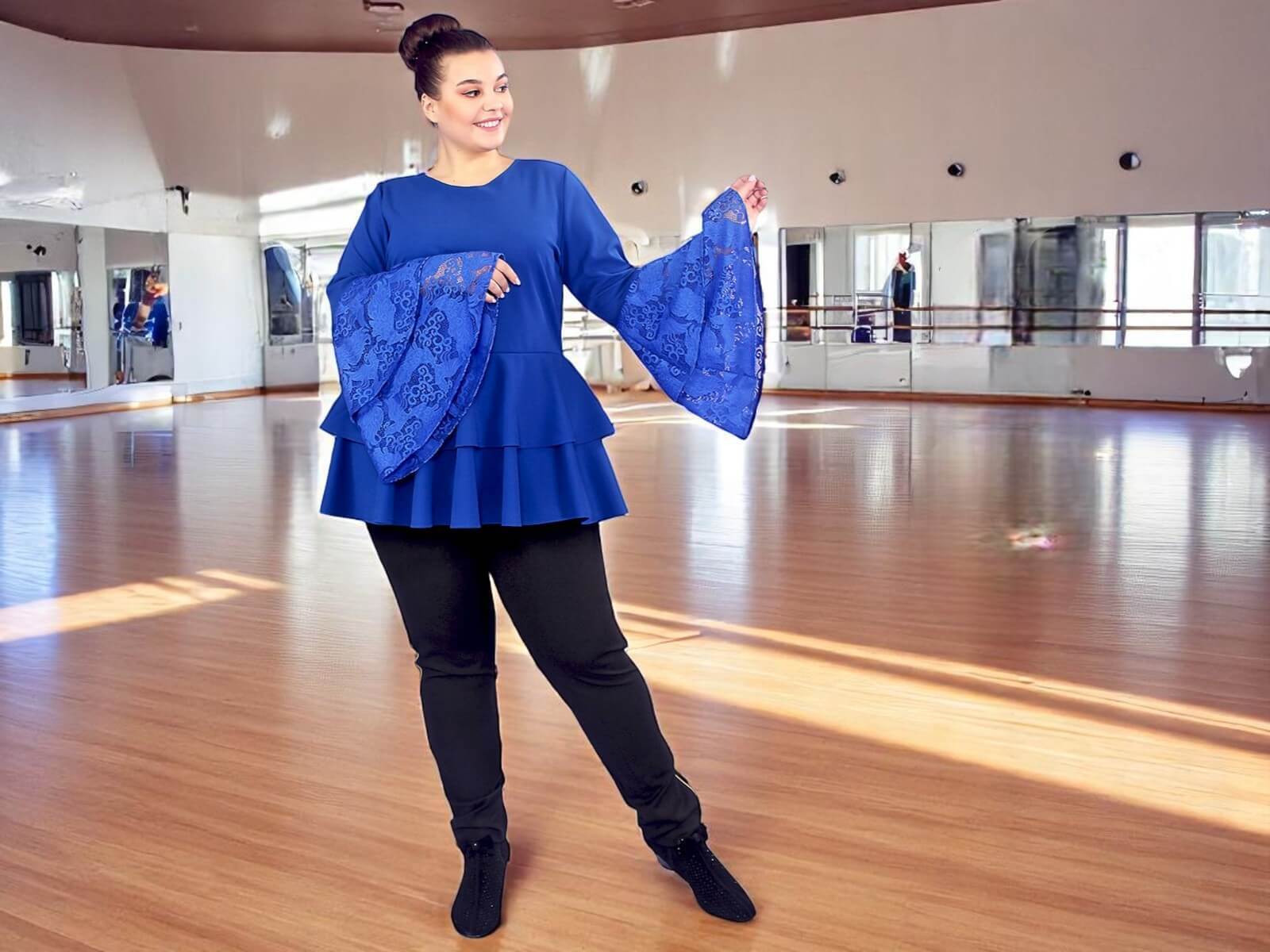 Романтичная блуза из креп трикотажа средней плотности. Ткань хорошо держит форму, не подчеркивая нюансы фигуры. Полуприлегающий фасон с двойной баской гармонизирует силуэт, обозначает талию и скрывает зону бедер и ягодиц. Шикарные втачные рукава с оборками из мягкого эластичного гипюра добавляют наряду женственности и лёкгости.