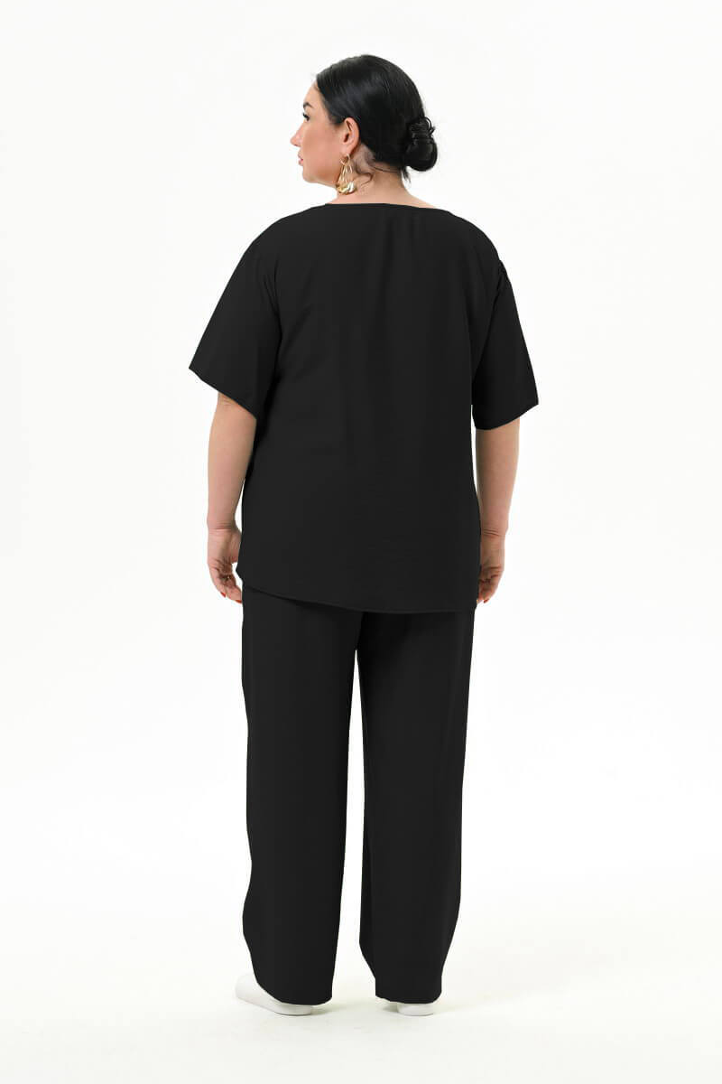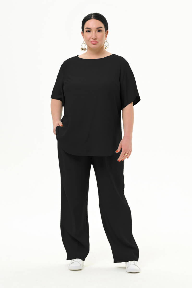 Вискоза, входящая в состав ткани, придает полотну мягкость и воздухопроницаемость, а полиэстер препятствует сминаемости. Цвет чёрный.