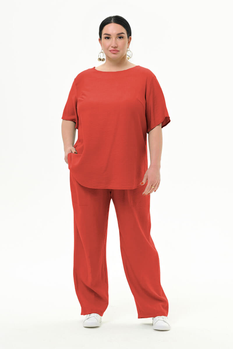 Вискоза, входящая в состав ткани, придает полотну мягкость и воздухопроницаемость, а полиэстер препятствует сминаемости. Цвет паприка.