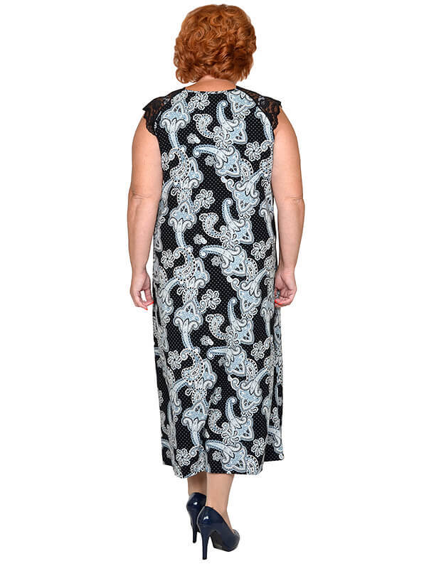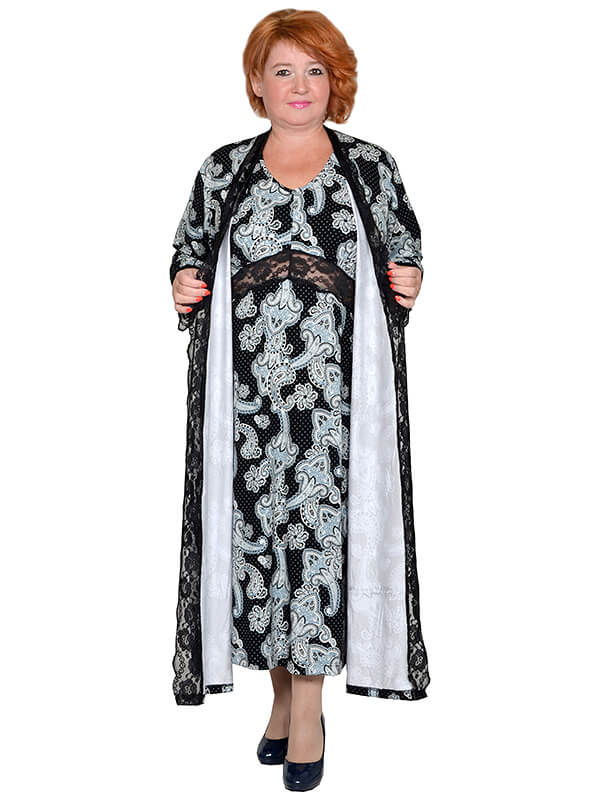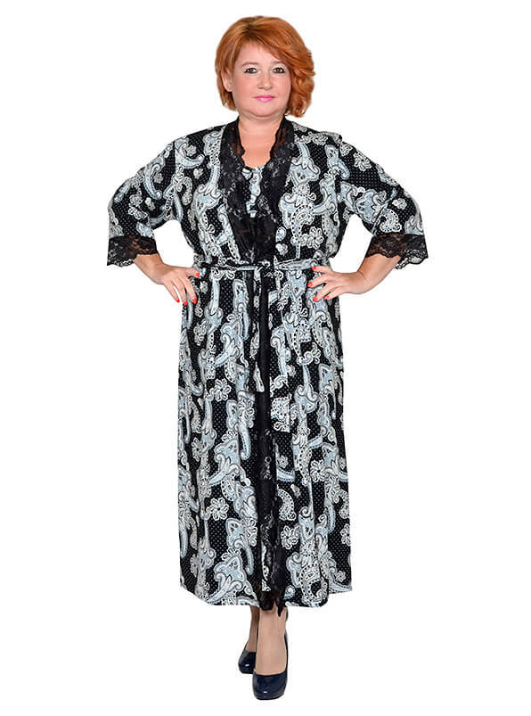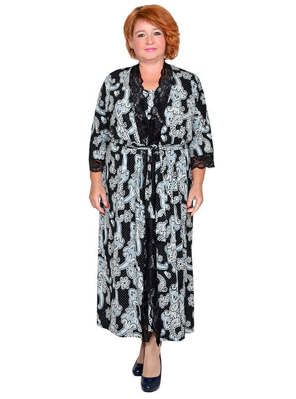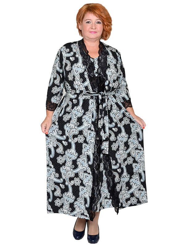 Эффектный халат-пеньюар выполнен из дышащего вискозного трикотажа с принтом, отделка - из мягкого бельевого эластичного кружева.