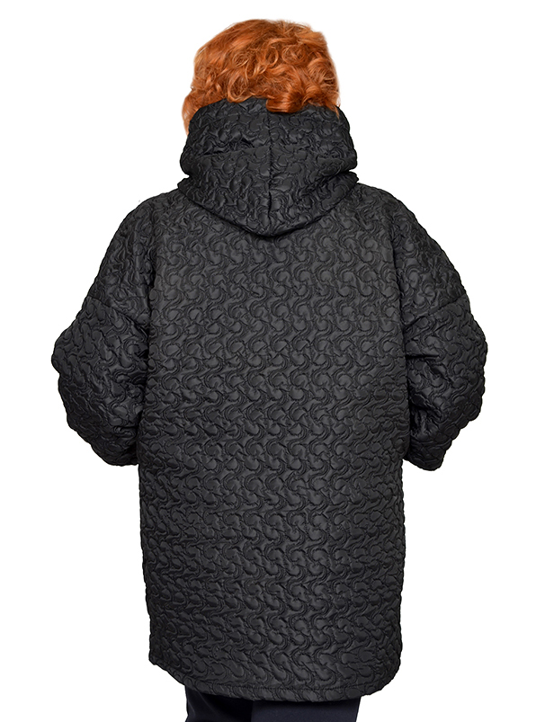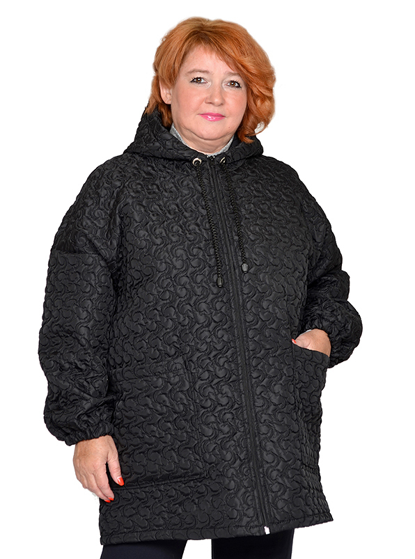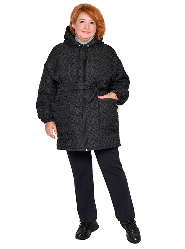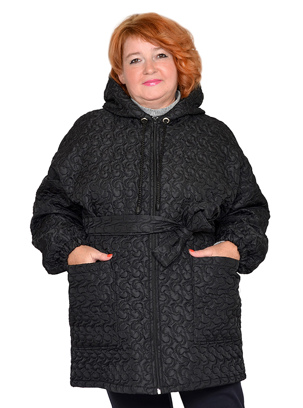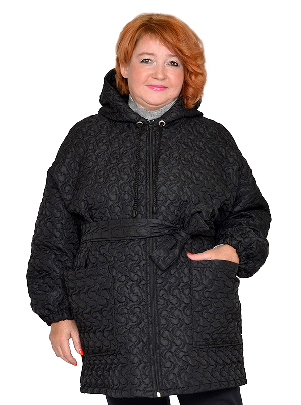 Фасон прямой. Одношовный капюшон с кулиской. Плечо спущено. Длинный рукав с резинкой по низу. Застёжка на молнию. Накладные карманы. Пояс в комплекте.