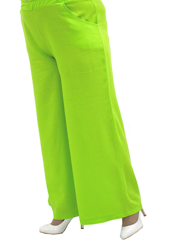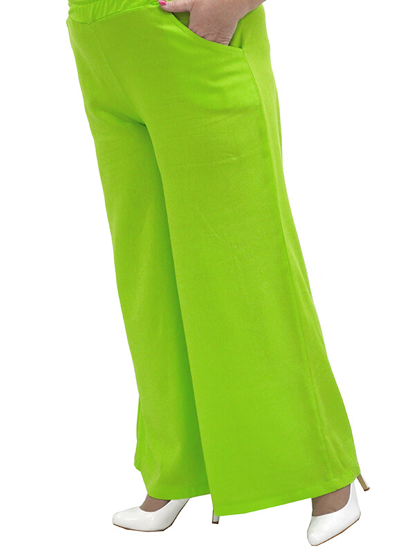 Фасон широкий прямой. Притачной пояс с широкой резинкой. Под поясом карманы с отрезным бочком.