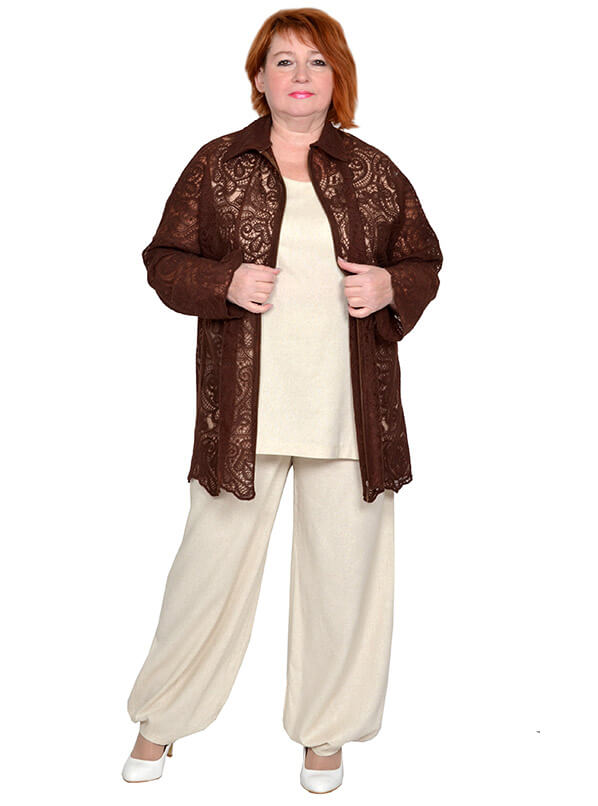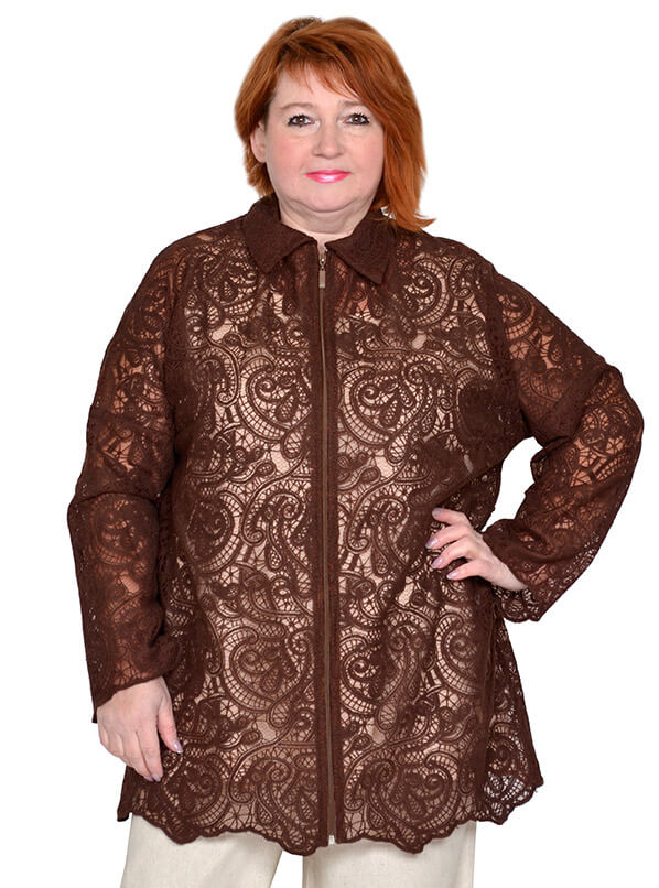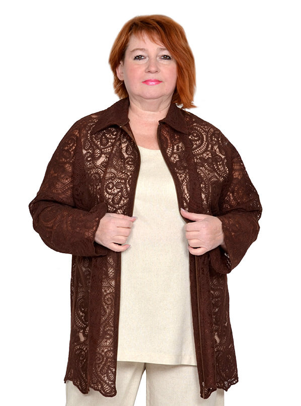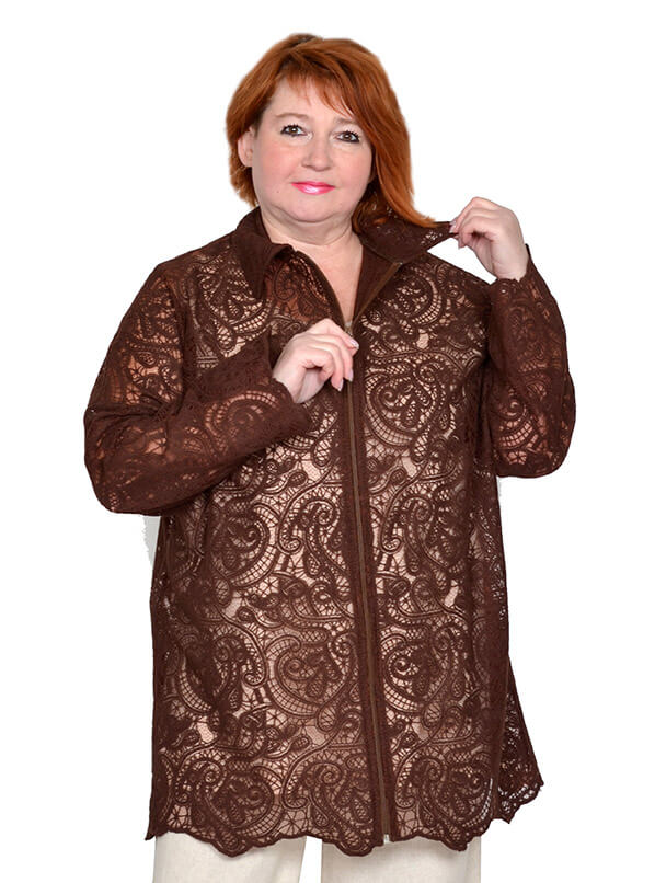 Летний шик в каждой детали: коричневый кружевной жакет‑рубашка - твой ключ к безупречному образу. Модель из изящного плетеного кружева. Чистый хлопок. Без подкладки.