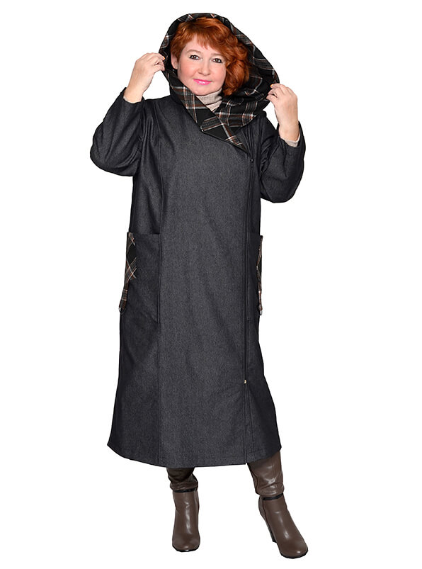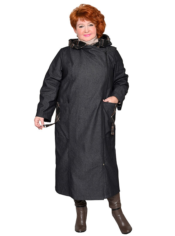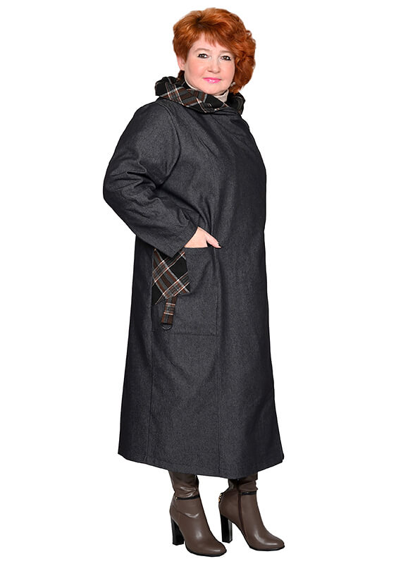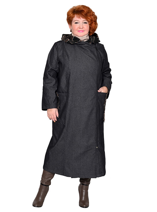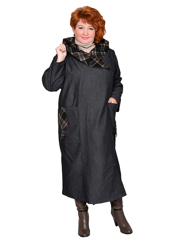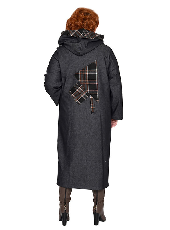 Элегантный джинсовый длинный плащ для весны и осени. Материал на основе хлопка, достаточно плотный, почти не тянется. Цвет графит. Отделка - из плотного плательного полотна в клетку. Модель без утеплителя и подкладки.