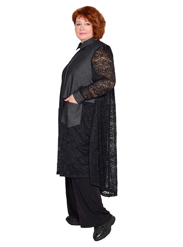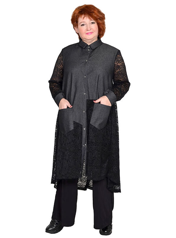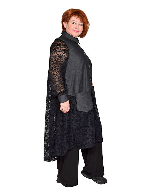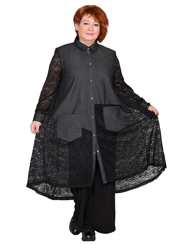 Эффектное платье-рубашка из джинсовой ткани цвета графит и плетеного чёрного кружева. Модель можно использовать, как удлиненную рубашку. Либо вторым слоем, как летний плащ-накидку, сочетая с топами и футболками.