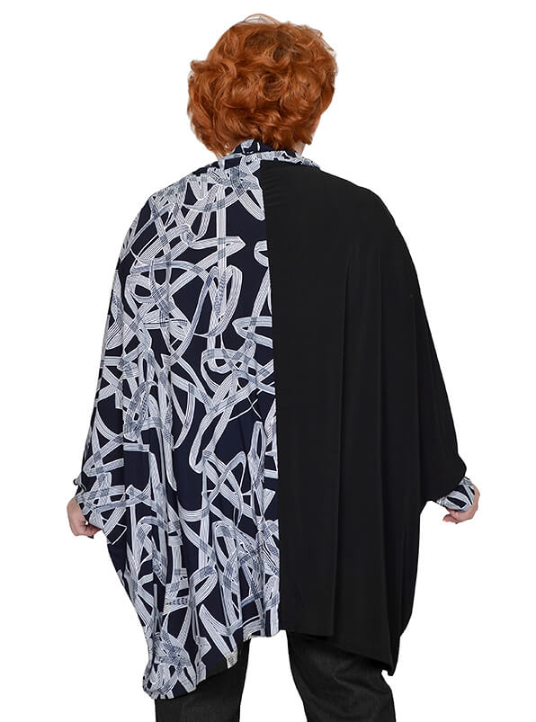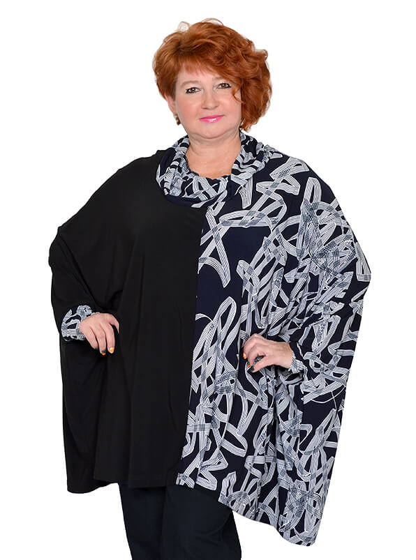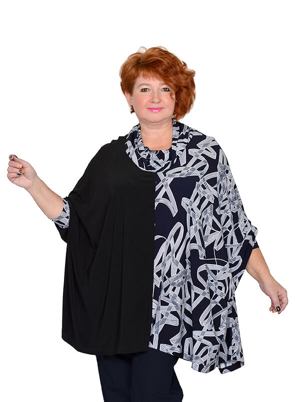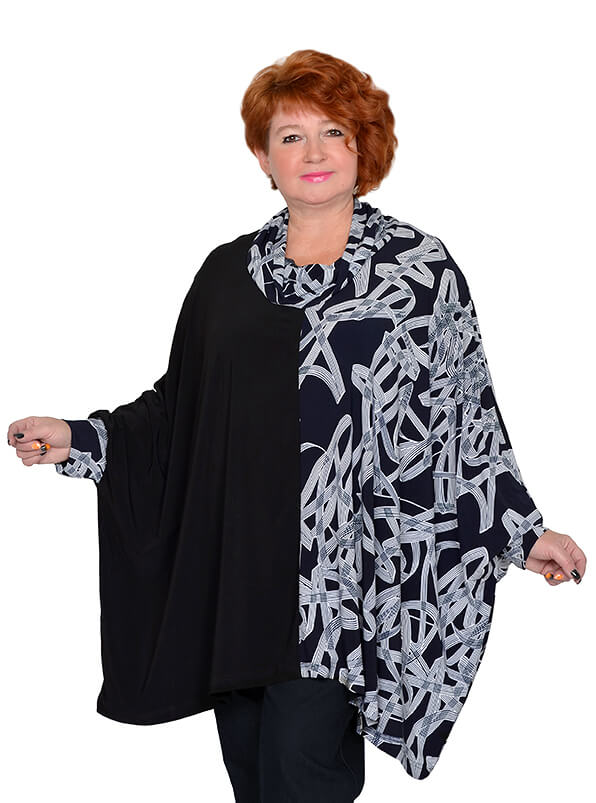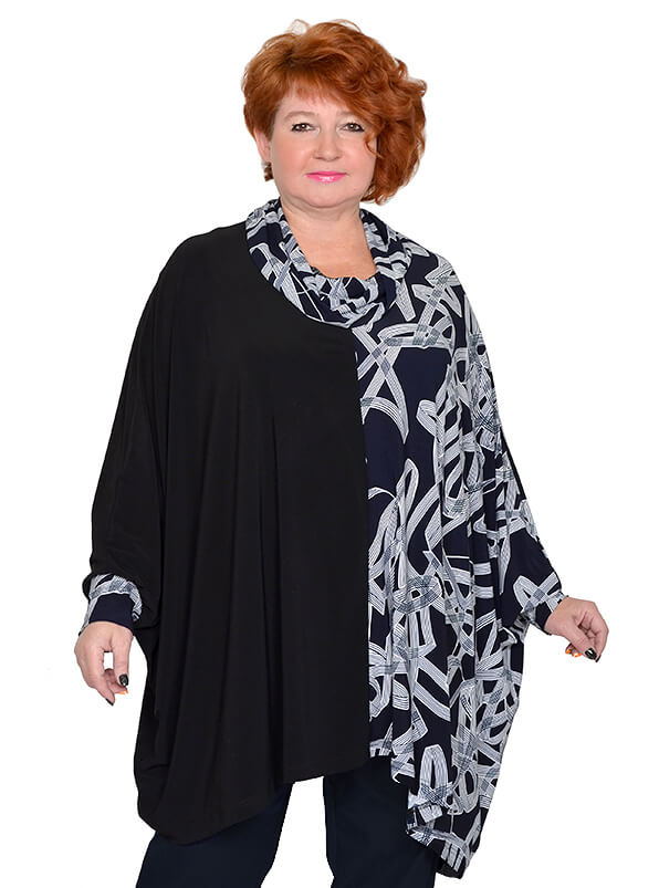 Эффектная туника очень свободного кроя. Выполнена из эластичного трикотажа масло двух расцветок. Ткань тонкая, струящаяся. Одна половинка туники черного цвета, вторая - тёмно-синяя с абстрактным принтом.