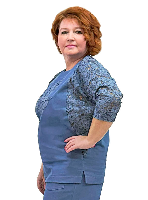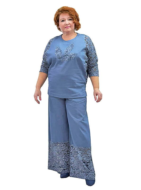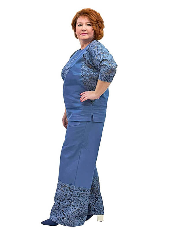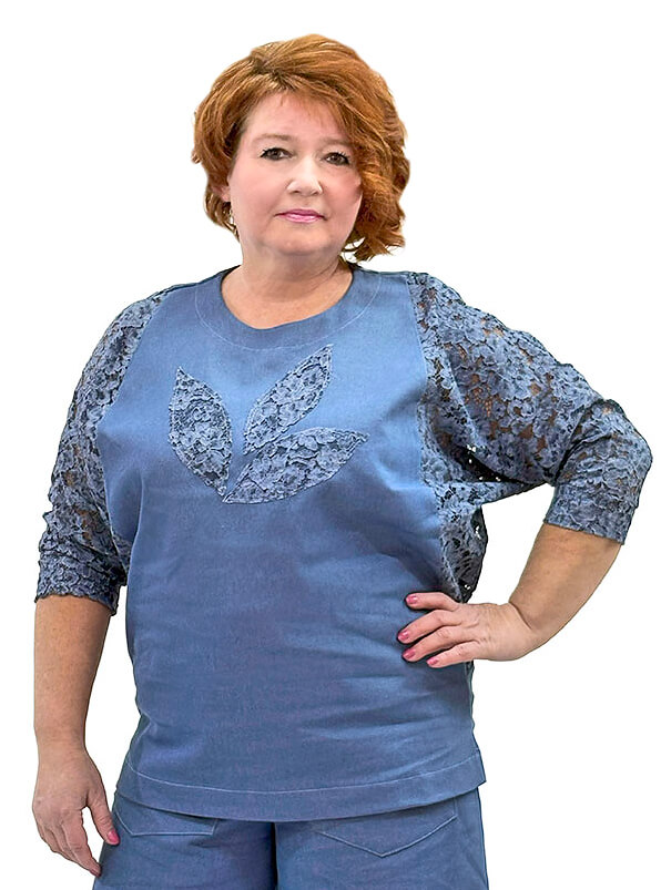 Фасон более свободный в зоне груди и плеч, полуоблегающий по бёдрам. Рукав на основе цельнокроенного. В боковых швах небольшие разрезы. На груди кружевная аппликация.