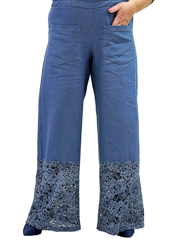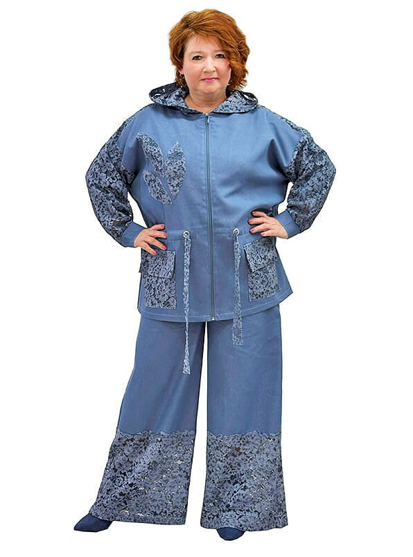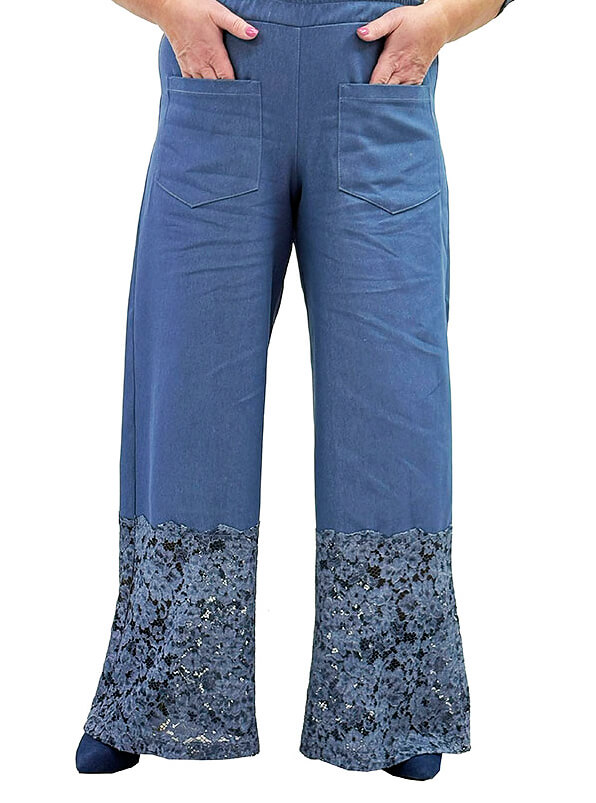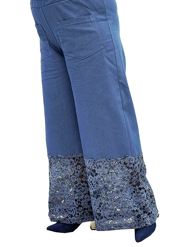 Комбинированная туника из темно-голубого денима и изящного плетеного кружева. Джинсовая ткань неэластичная, средней плотности, на основе хлопка. Кружево из чистого хлопка, мягкое, не тянется.