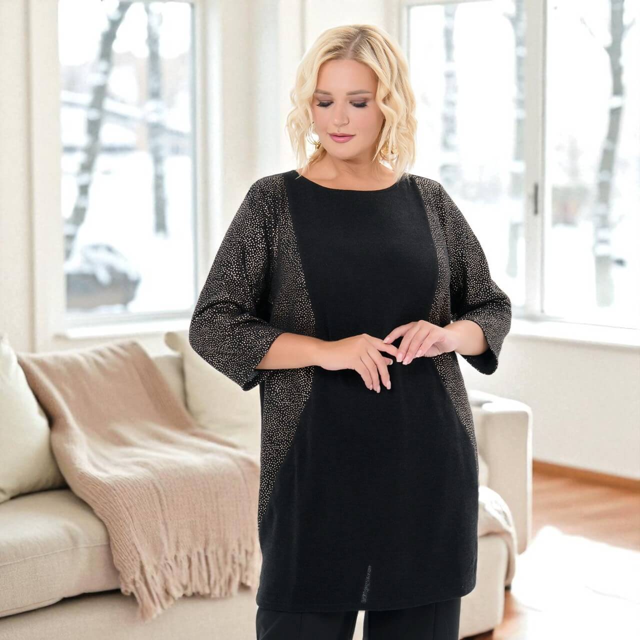 Прямой фасон. Особенность конструкции туники - в отсутствии боковых швов. Спинка переходит в переднюю часть на уровне вертикальных рельефных швов, зрительно вытягивающих силуэт. Рельефы выполнены с карманами и разрезами. Задняя часть удлиненная на 6 см. Удобный свободный рукав длиною ниже локтя.