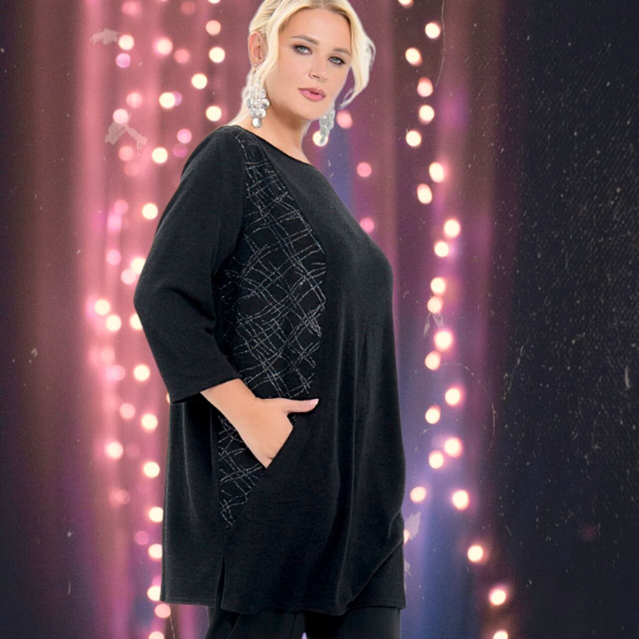 Комбинированная туника для прохладных сезонов. Изготовлена из черного трикотажа, имитирующего ангору. Материал мягкий, шелковистый, почти невесомый, не колется, не мнётся. Боковые вставки - с деликатным серебристым напылением.