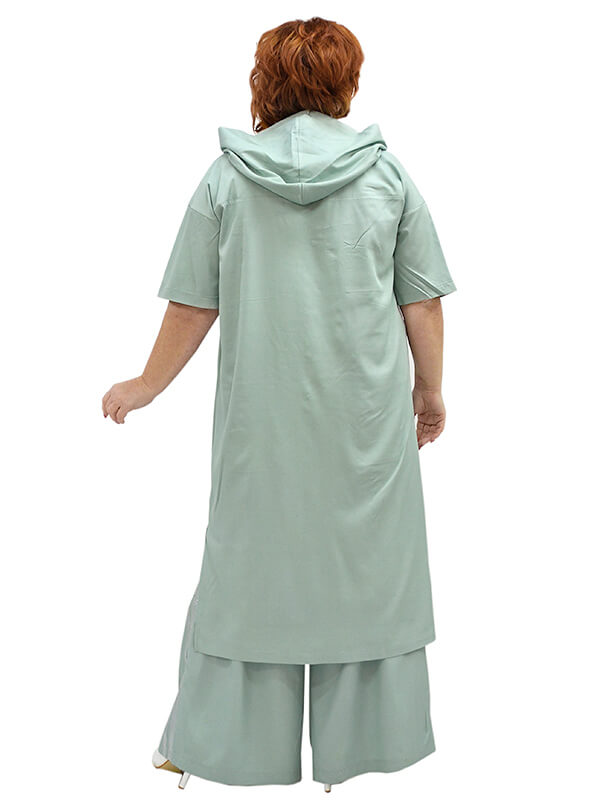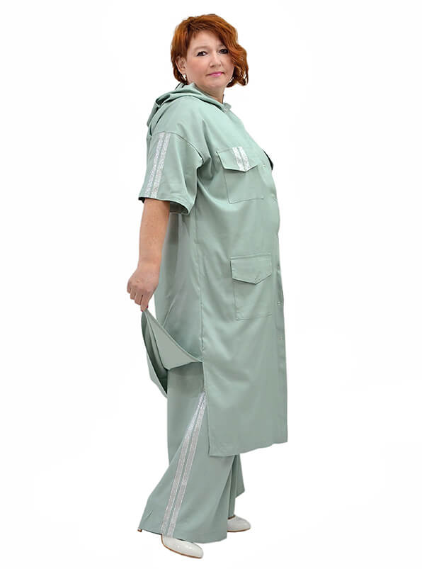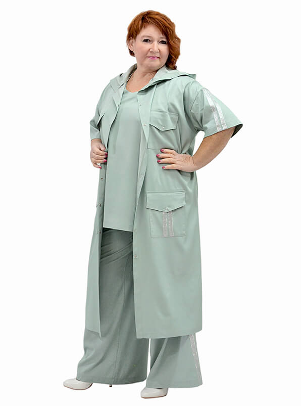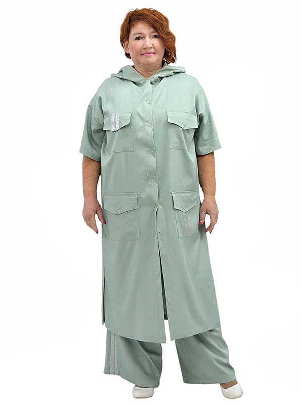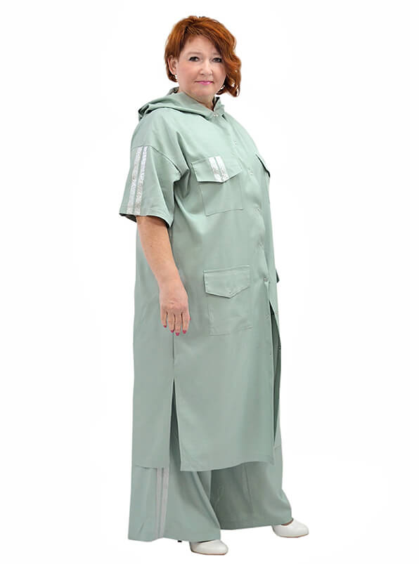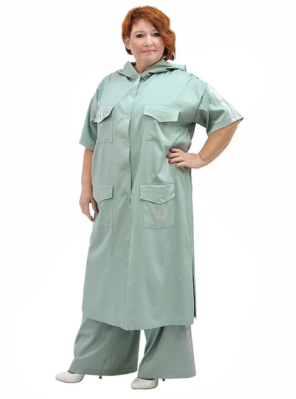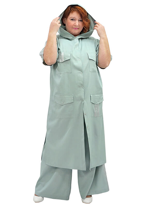 Фасон прямой свободный. Капюшон. Плечо спущено. Короткие рукава с лампасами. Полочки с накладными карманами. Боковые разрезы. Застёжка на кнопки.
