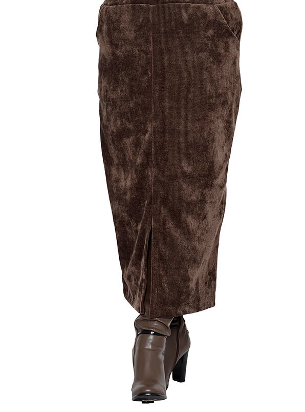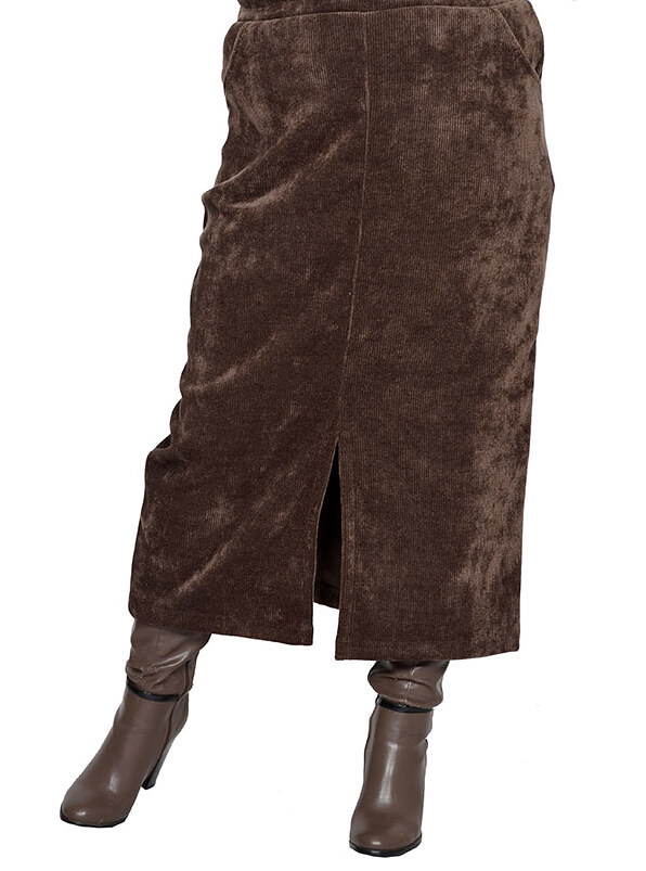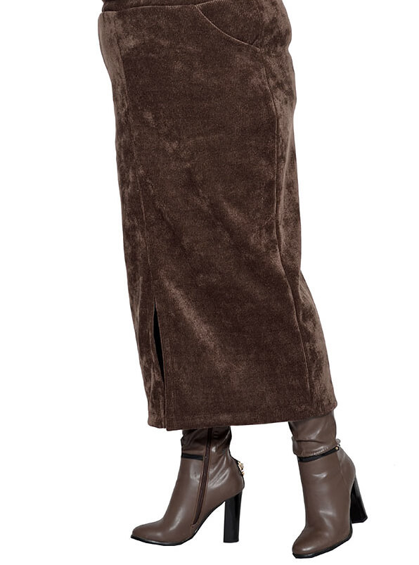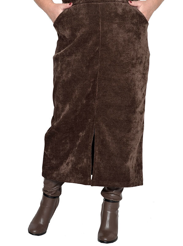Коричневая юбка-миди из микровельвета для прохладных сезонов. Ткань упругая, тёплая, хорошо тянется, приятная на ощупь.
