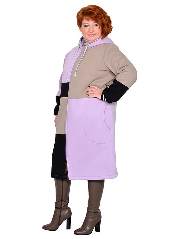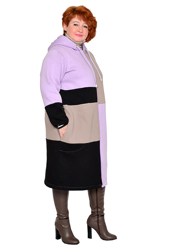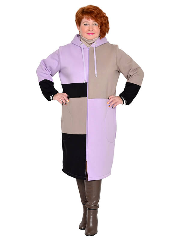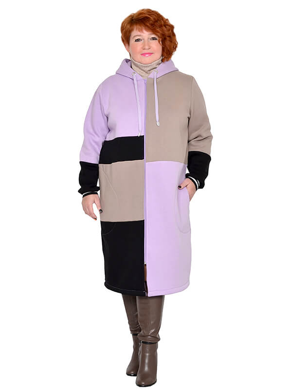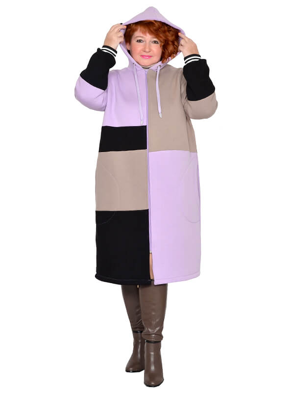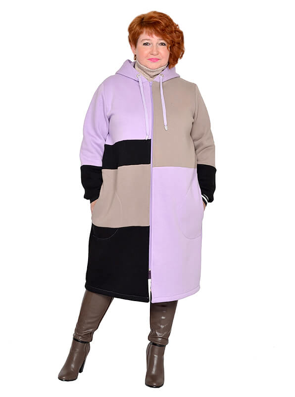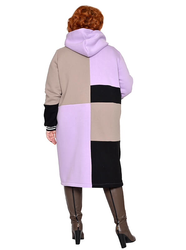 Удлинённое зимнее зип-худи в стиле колорблокинг. Изготовлено из футера трёхнитки - плотного тёплого трикотажа на хлопковой основе. Лицевая сторона гладкая, изнанка с начёсом. Цвета блоков светло-фиолетовый, бежевый, чёрный.